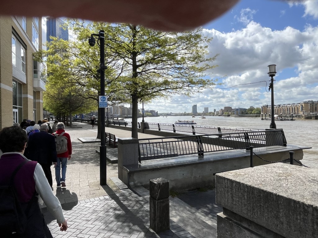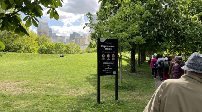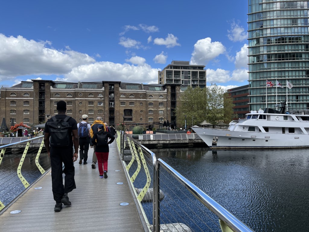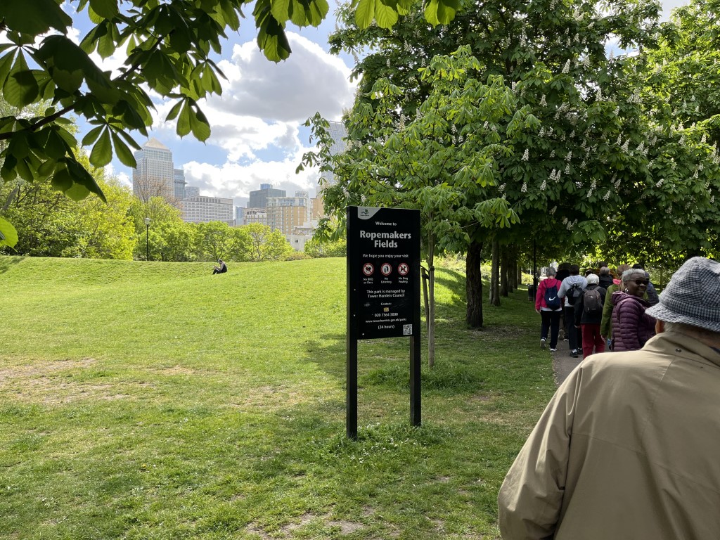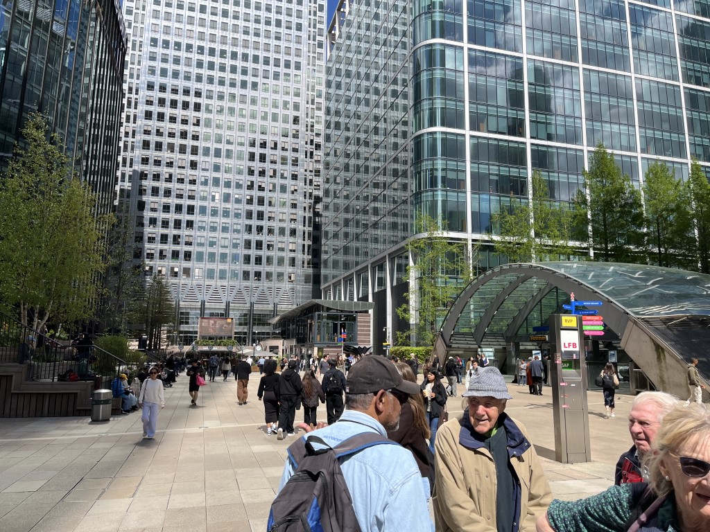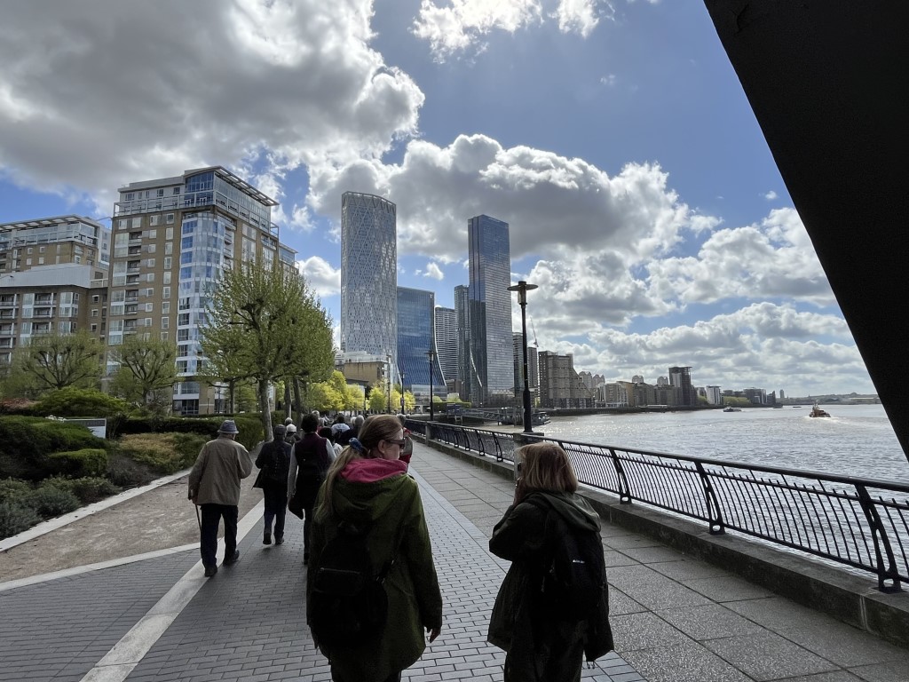 It was mostly easy, level walking- firm paths and tracks, starting at Mile End tube station and then walking down to Canary Wharf. It was mostly in parks along the way and included a walk along the Thames, down into the Isle of dogs and through Mudchute Park. There we stopped for lunch before continuing to Canary Wharf and a nearby Weatherspoons pub.